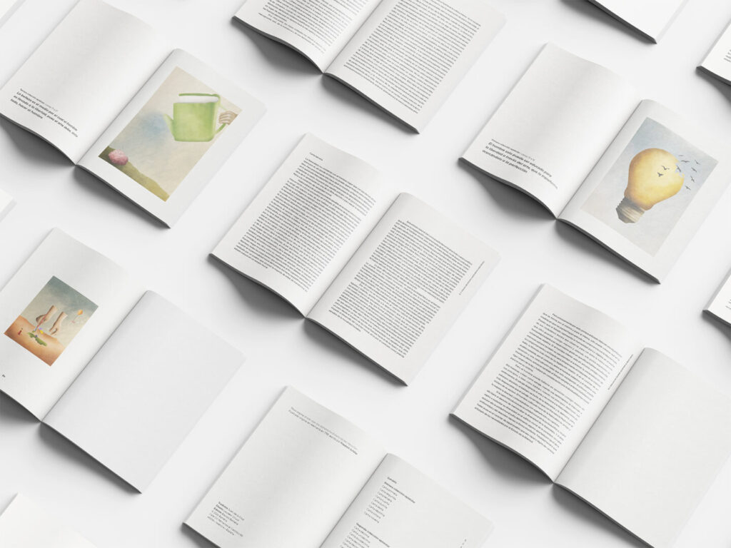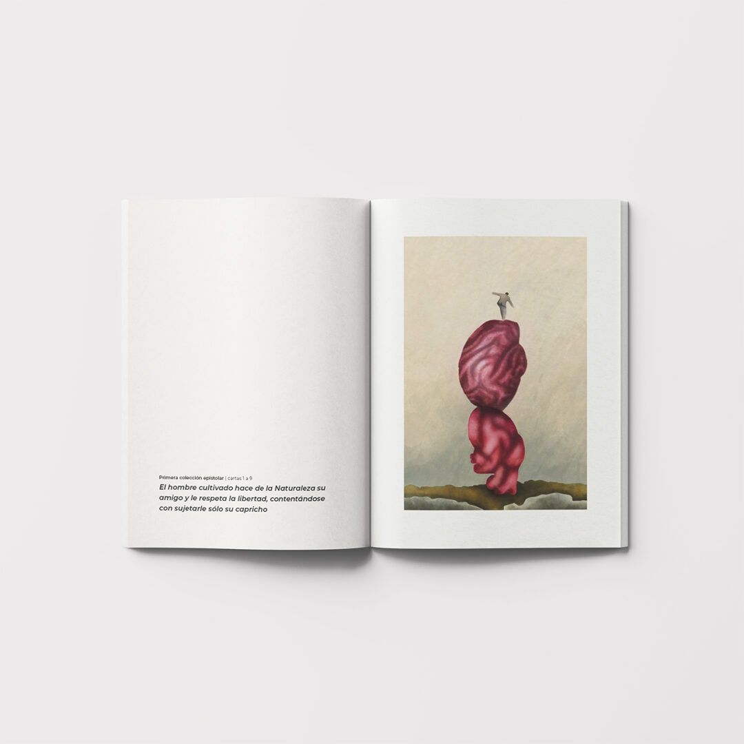 Generous margins, a narrow typographic hierarchy and clear pacing help the reader navigate long philosophical passages. Each chapter opens with a custom illustration that visually interprets key themes through symbolic and slightly surreal imagery.